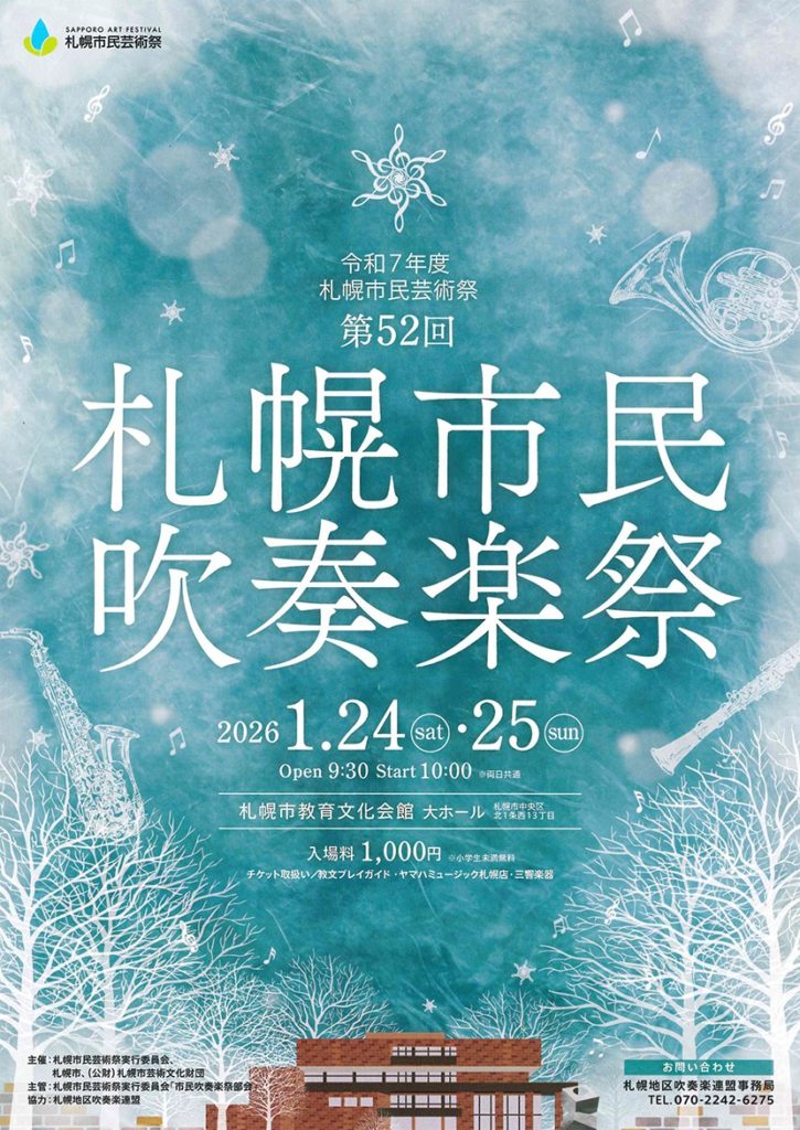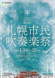 1月25日(日)に行われた令和7年度札幌市民芸術祭 第52回札幌市民吹奏楽祭での演奏を無事に終えました。演奏を聞きに来て下さったみなさま、ありがとうございました。この日の札幌は大雪で交通が麻痺しており、あわや間に合わないかもしれない、という団員もいましたが、無事に全員で演奏を終えることができました。